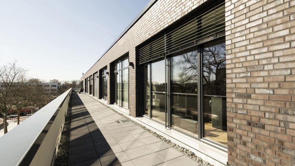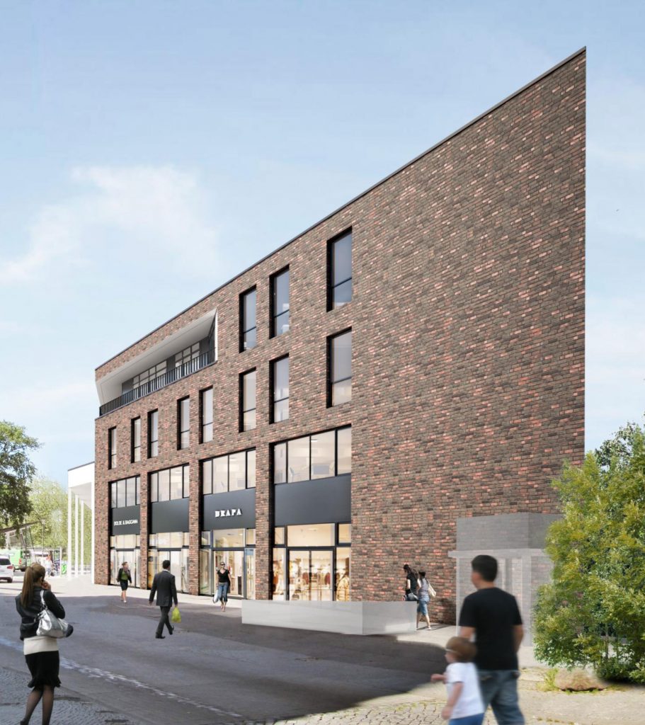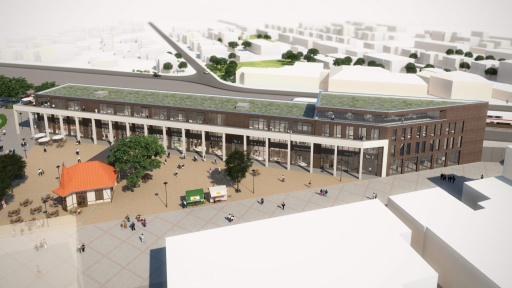 Das Erdgeschoss des Komplexes mit der markanten Gebäudespitze wird reichlich Platz für Gastronomie und Einzelhandel mit der Möglichkeit zur Außenbestuhlung bieten, in den Obergeschossen entstehen lichtdurchflutete Büro- und Praxisräume mit über 3m hohen Decken und großen, bodentiefen Fenstern. Die Dachterrassen im 2. und 3. Obergeschoss bieten zudem einen außergewöhnlichen Blick über Marktplatz und Fußgängerzone. Der Zugang zum Gebäude ist durch die Ebenerdigkeit und die schwellenlose Ausführung barrierefrei gestaltet.